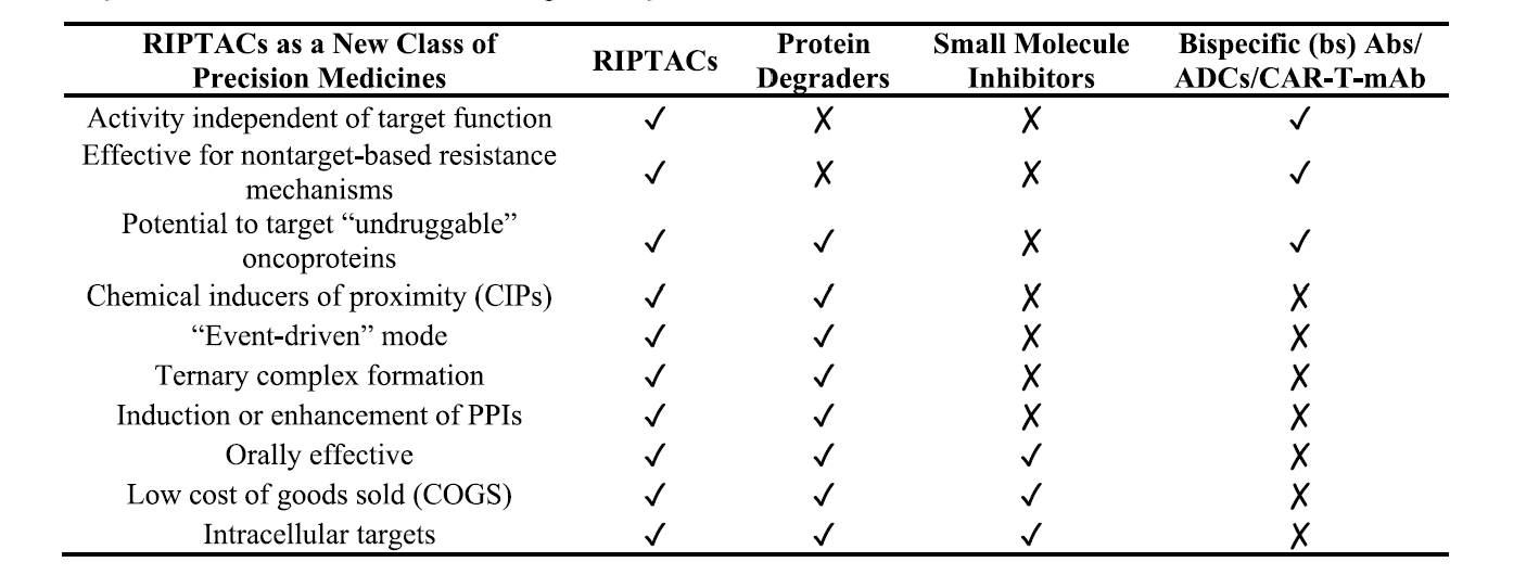 上图对比了 RIPTACs 与其他癌症治疗模式的关键特性:RIPTACs 通过诱导 TP 和 EP 之间的近邻关系,形成三元复合物,抑制 EP 功能,实现选择性杀伤癌细胞。与小分子抑制剂和蛋白降解剂不同,RIPTACs 的作用不依赖于 TP 功能,且对非靶点抗性机制有效,能够靶向“不可成药”蛋白。与双特异性抗体(bsAbs)、抗体-药物偶联物(ADCs)和 CAR-T-mAb 相比,RIPTACs 可以口服,且靶向细胞内 TP。