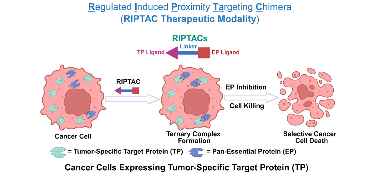 (1)结构组成:RIPTACs是一类异双功能分子,包含一个针对肿瘤特异性靶蛋白(TP)的配体、一个针对泛必需蛋白(EP)的配体以及连接这两个配体的连接链。TP在癌细胞中特异性表达,而EP对细胞生存至关重要。