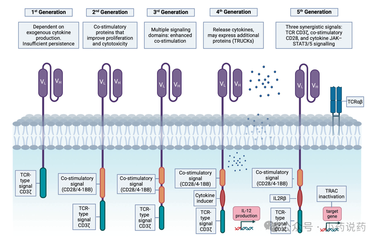 在下一代CAR-T细胞中,第五代与先前版本的不同之处在于整合了一个额外的膜受体。一种有前景的方法涉及整合IL-2受体信号以实现抗原依赖性JAK/STAT通路激活。这种信号不仅维持CAR-T细胞活性并促进记忆T细胞形成,还能重新激活和刺激更广泛的免疫系统。
