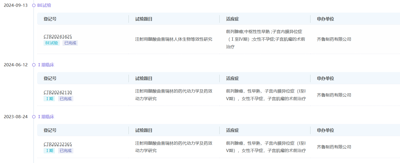 11月19日,据CDE官网信息显示,齐鲁制药以4类仿制药递交的注射用醋酸曲普瑞林上市申请已获受理。